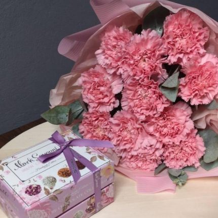 Букет «Влюбленность» (Премиальная роза O Hara, роза кустовая, роза красная, диантусы и эвкалипт)