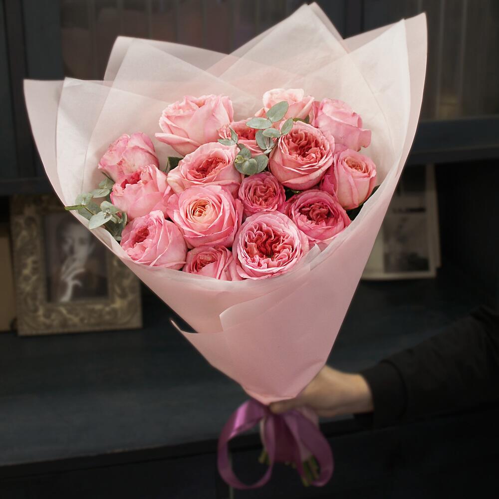Букет из 15 розовых пионовидных роз с эвкалиптом