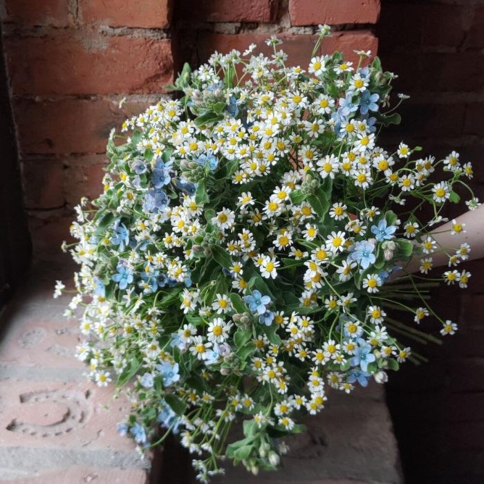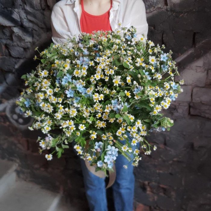 Букет из матрикарии и твидии в стильной упаковке “Луговая нежность”