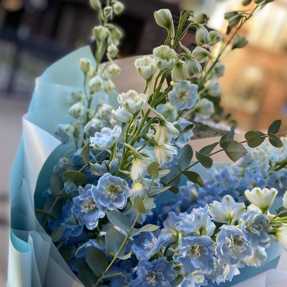 Дельфиниум – 5 шт.Эвкалипт – 3 шт.Лента атласная – 1 шт.Упаковка дизайнерская – 6 шт.