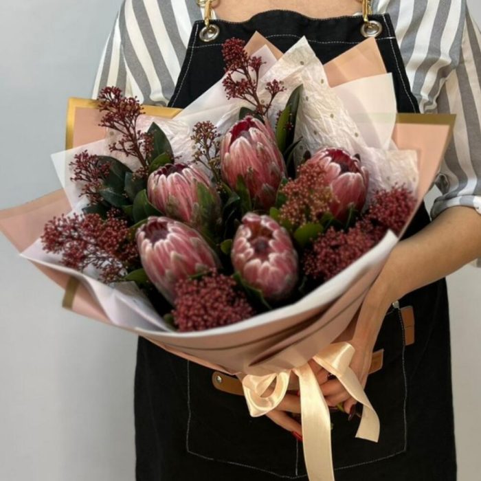 Прекрасный, экзотический и очень стойкий букет из протеи и скимии! Отлично подойдёт для коллеги, и близкого человека. Букет хорошо смотрится в качестве основного подарка, и может быть как дополнение к основному подарку.