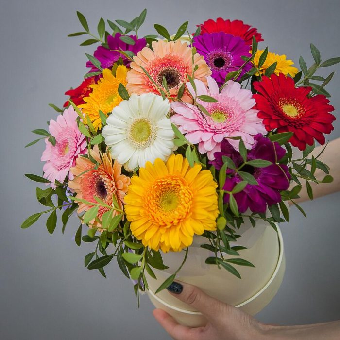 Гербера желтая – 3 шт.Гербера красная – 3 шт.Гербера розовая – 3 шт.Гербера белая – 2 шт.Гербера кремовая – 2 шт.фиолетовая – 2 шт.