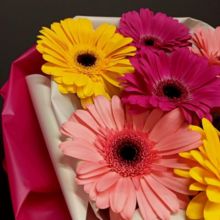 Гербера – 7 шт.зелень декоративная – 1 шт.Упаковка дизайнерская – 1 шт.