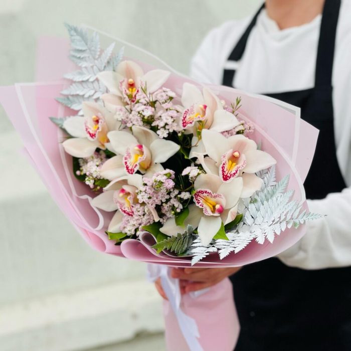 Орхидея Цимбидиум – 7 шт.Папоротник – 2 шт.Рускус – 10 шт.Лента атласная – 1 шт.Упаковка дизайнерская – 4 шт.гипсофила радужная – 2 шт.