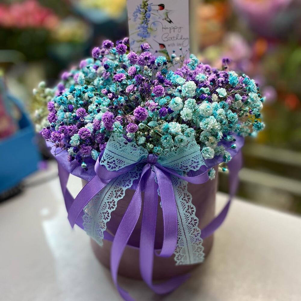 «Лавандовое созвездие» Букет из розы, гвоздики, статица и хлопка