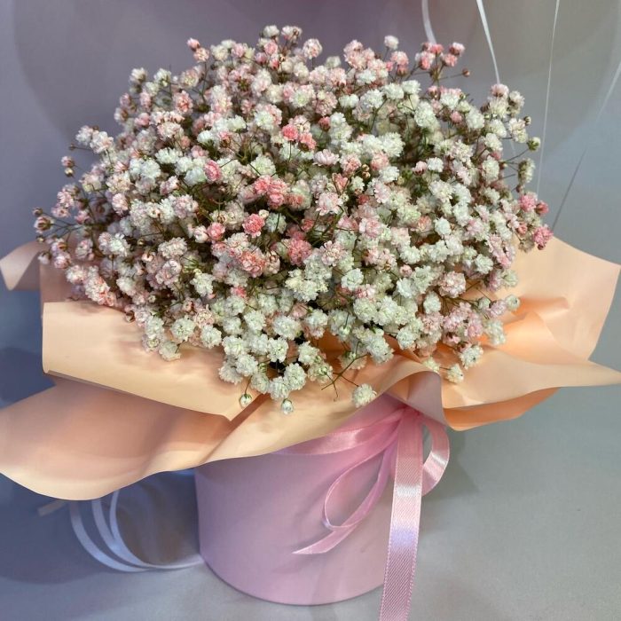 Гипсофила – 5 шт.Шары воздушные – 3 шт.Шляпная коробка с лентами – 1 шт.