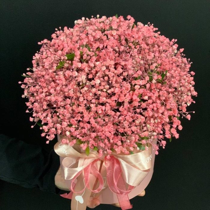 “Сиреневый туман” – композиция из гипсофилы в шляпной коробке