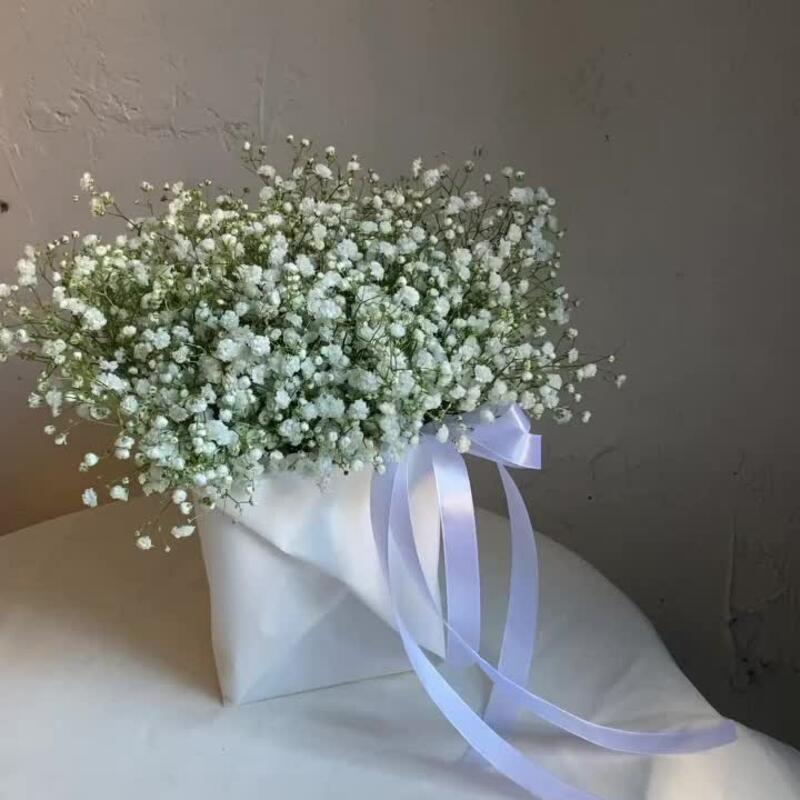 гипсофила белая – 5 шт.Упаковка дизайнерская – 2 шт.Лента атласная – 2 шт.открытка для пожеланий – 1 шт.