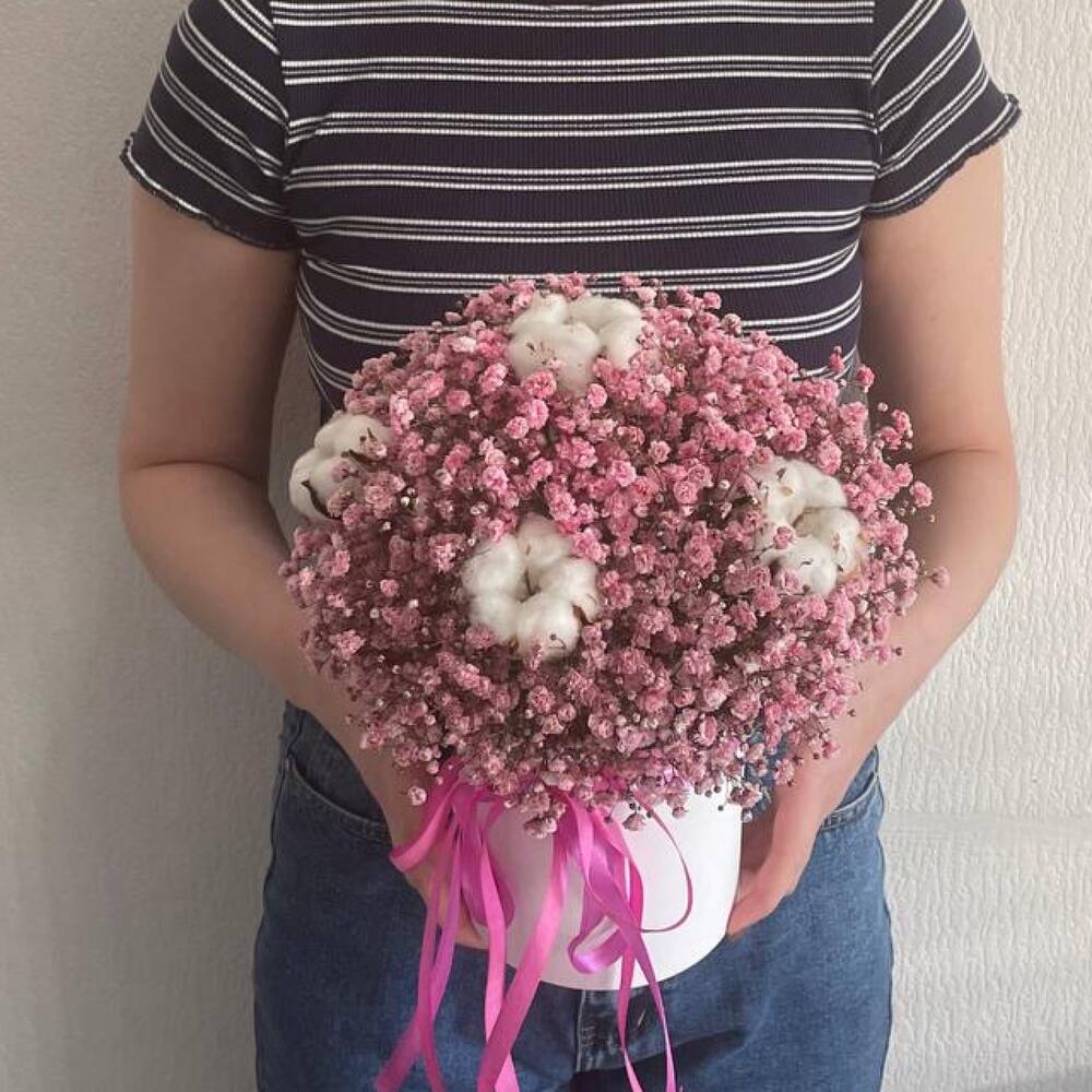 “Сиреневый туман” – композиция из гипсофилы в шляпной коробке