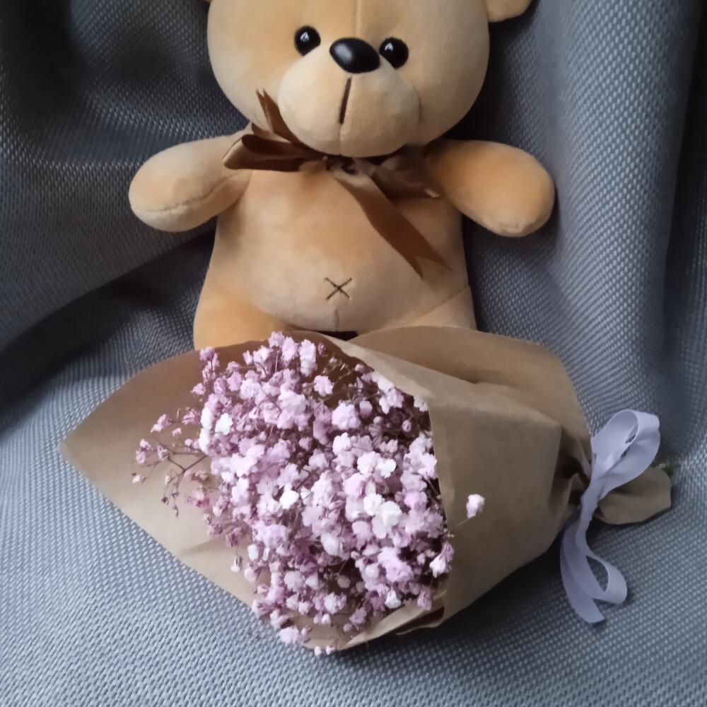 Гипсофила – 5 шт.Лента атласная – 1 шт.Крафт упаковка – 1 шт.Мишка плюшевый – 1 шт.