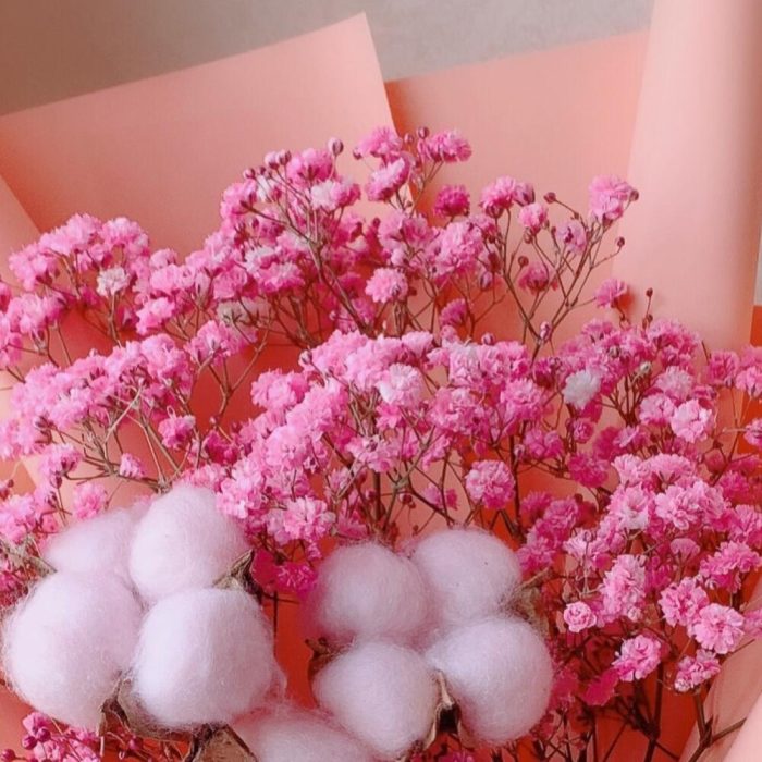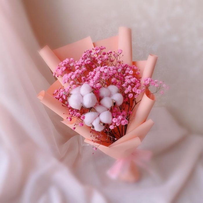 Хлопок – 3 шт.Лента атласная – 1 шт.Гипсофила розовая – 1 шт.Дизайнерская упаковка – 1 шт.