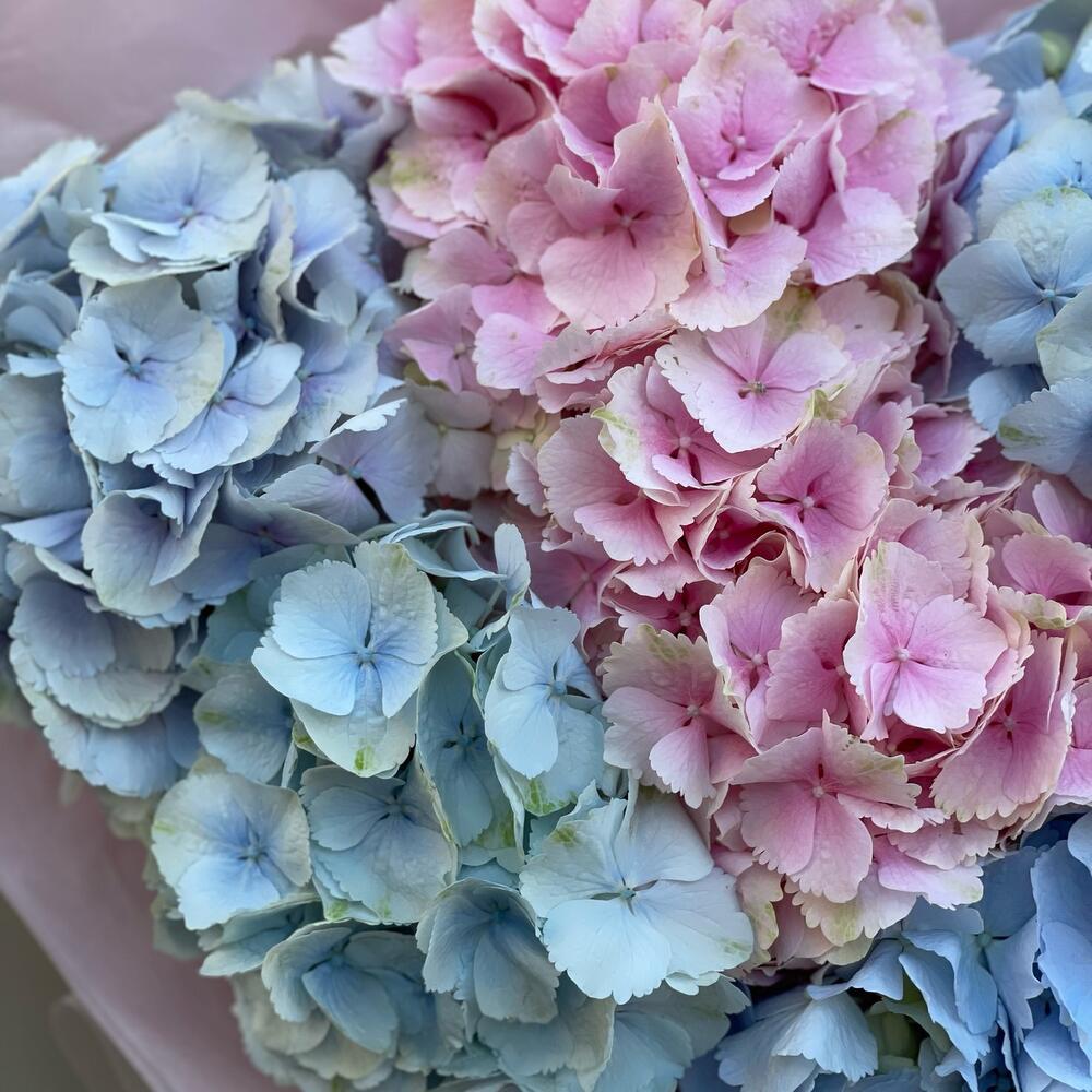 Нежное воздушное облако из микса гортензий Очень объемный букет в воздушной матовой полупрозрачной упаковке