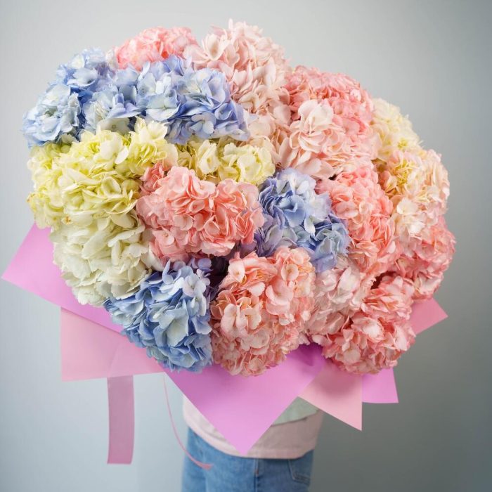 Авторская композиция из гортензий, роз и ранункулюсов в шляпной коробке