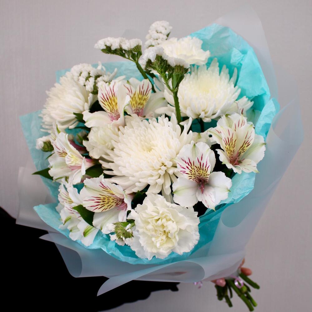 Хризантема одноголовая – 3 шт.Альстромерия – 3 шт.Гвоздика – 3 шт.Статица – 1 шт.Рускус – 1 шт.Упаковка дизайнерская – 3 шт.