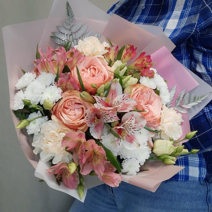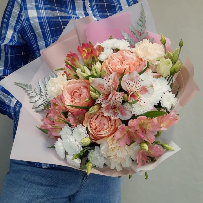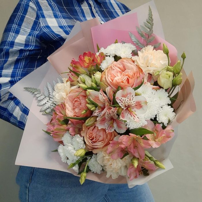 Роза пионовидная – 3 шт.Альстромерия – 4 шт.Сантини – 3 шт.Лизиантус – 3 шт.Диантус – 3 шт.Папоротник – 3 шт.Рускус – 10 шт.Упаковка дизайнерская – 2 шт.Лента атласная – 1 шт.