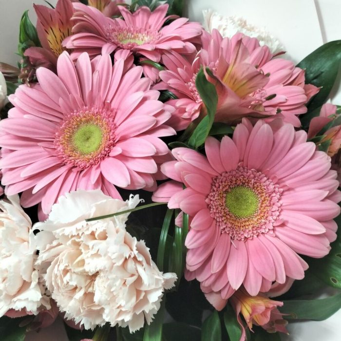 Упаковка – 2 шт.Лента атласная – 1 шт.Гвоздика сортовая – 4 шт.Альстромерия Микс Европа – 3 шт.гербера стандарт – 5 шт.