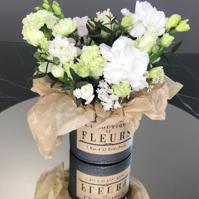 Лизиантус – 1 шт.Фрезия – 2 шт.Гвоздика – 2 шт.Гвоздика кустовая – 2 шт.Жестяное кашпо – 1 шт.комплимент от polyanka – 1 шт.