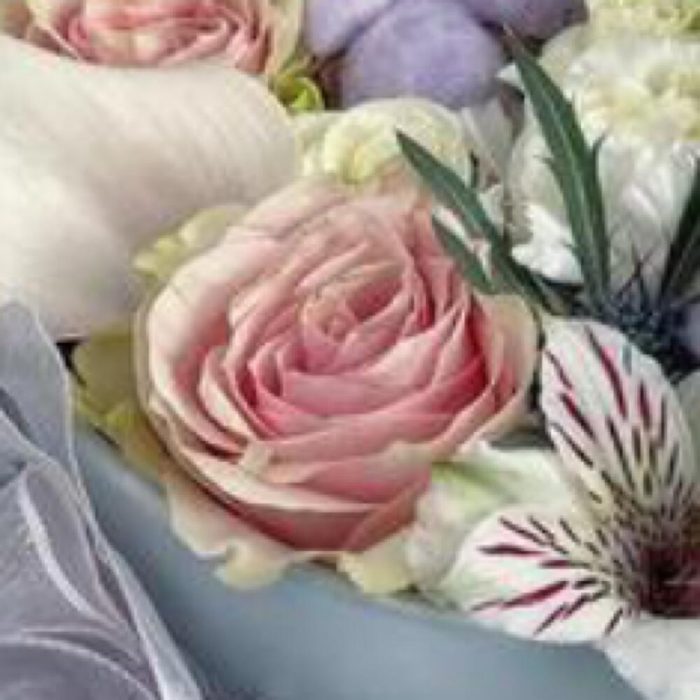 Альстромерия – 1 шт.Хлопок – 3 шт.Роза – 3 шт.Кустовая роза – 2 шт.Гвоздика – 4 шт.Оазис – 1 шт.Бант – 3 шт.Коробка – 1 шт.