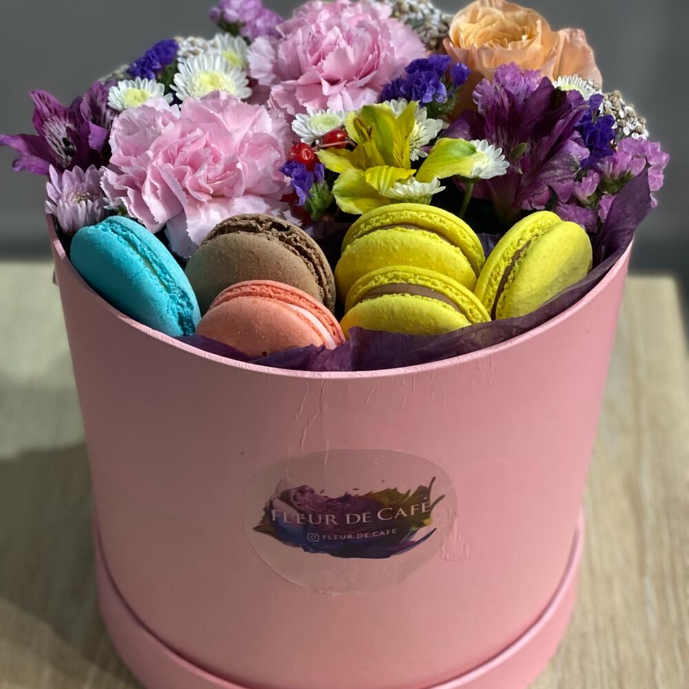 Гвоздика – 2 шт.Оазис флористический – 1 шт.макарон (пирожное) – 6 шт.Коробка шляпная – 1 шт.Бумага тишью – 1 шт.Сезонные цветы – 3 шт.