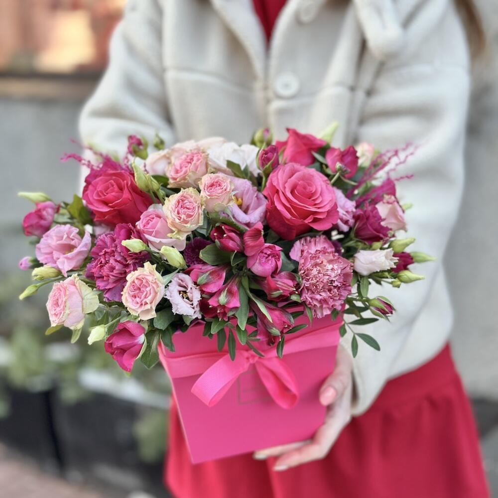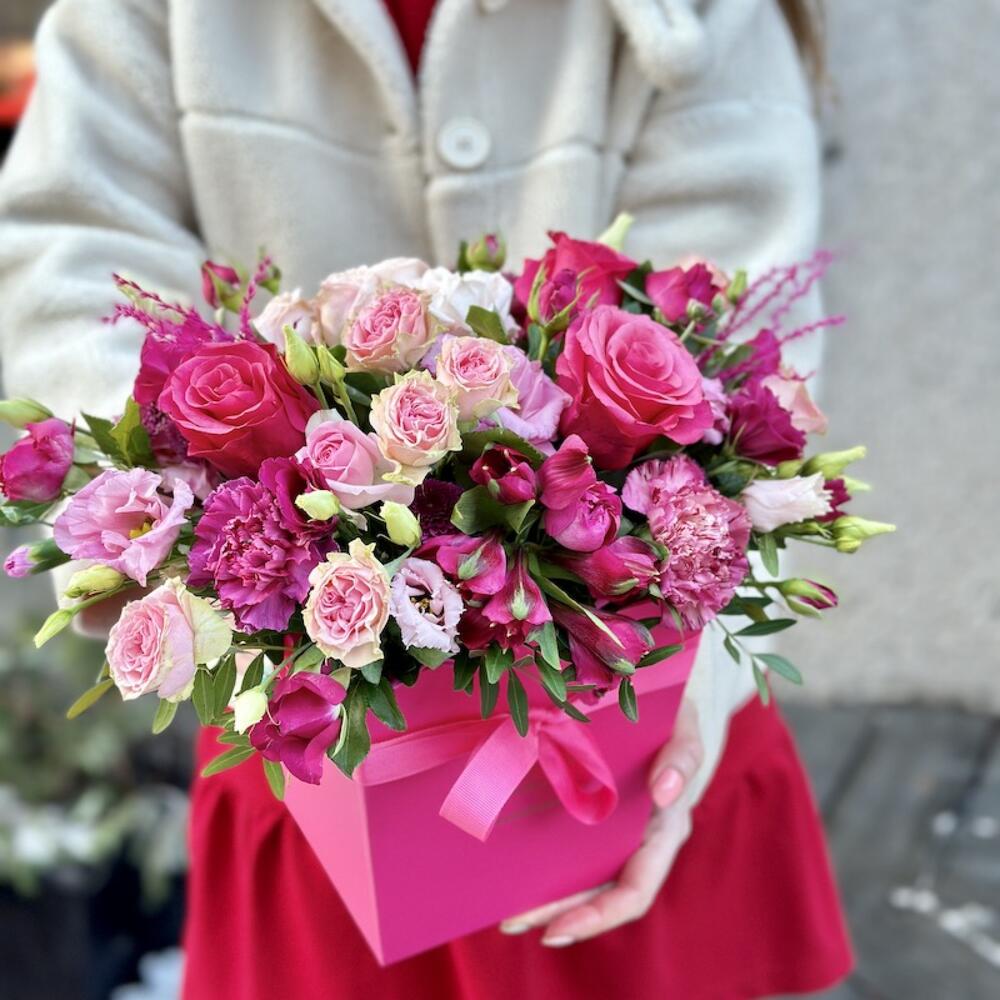 Роза – 3 шт.Роза кустовая – 2 шт.Лизиантус – 2 шт.Альстромерия – 2 шт.Диантус – 4 шт.декоративная зелень – 6 шт.цветы микс – 3 шт.Коробка – 1 шт.Флористическая губка – 1 шт.