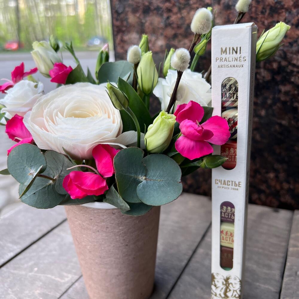 Лизиантус – 1 шт.Эвкалипт – 1 шт.Ранункулюс – 1 шт.Оазис флористический – 1 шт.стакан кофейный – 1 шт.шоколад счастье – 1 шт.соломиа гвоздика – 2 шт.