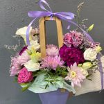 Хризантема кустовая – 2 шт.Эустома – 2 шт.Лента атласная – 1 шт.Диантус – 3 шт.Фисташка – 1 шт.Сумочка – 1 шт.Лимониум сиреневый – 2 шт.Оазис флористический – 1 шт.