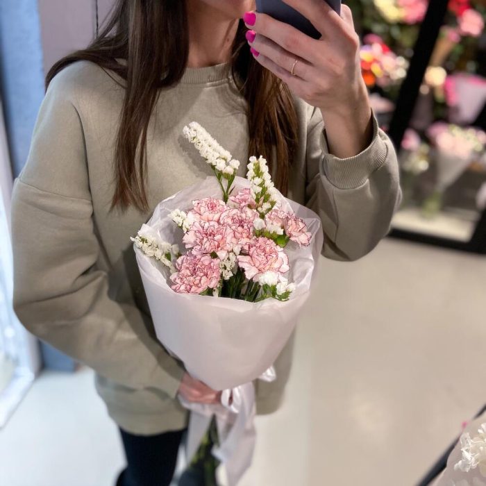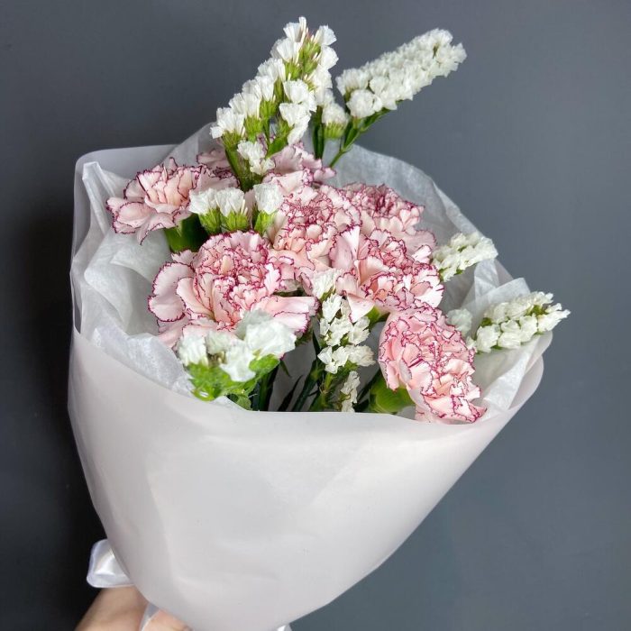 Невероятной стойкий букет с необычными гвоздиками и белыми веточками статица будет долго радовать и удивлять свою получательницу