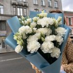 Лента атласная – 2 шт.Лизиантус белый – 5 шт.Упаковка корейская пленка – 1 шт.диантус белоснежный – 11 шт.