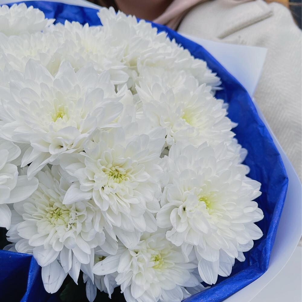 Хризантема кустовая – 5 шт.Тишью – 1 шт.бумага матовая – 1 шт.Лента – 1 шт.