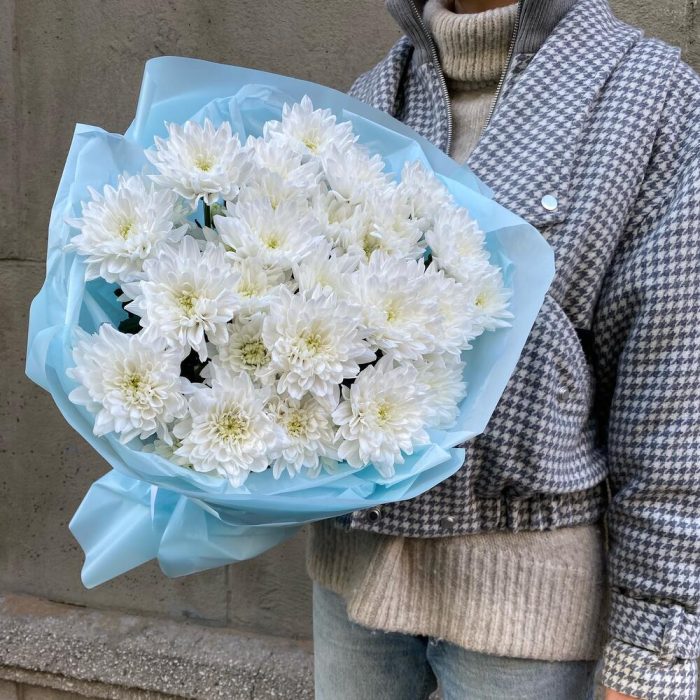 Хризантема кустовая белая – 5 шт.Тишью – 3 шт.Упаковка дизайнерская – 4 шт.лента атласная брендированная – 1 шт.