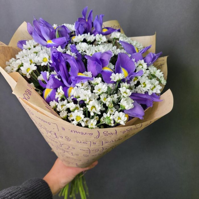 Хризантема кустовая Сантини – 6 шт.Ирис Blue Magic – 5 шт.Упаковка крафт – 1 шт.Джут – 1 шт.