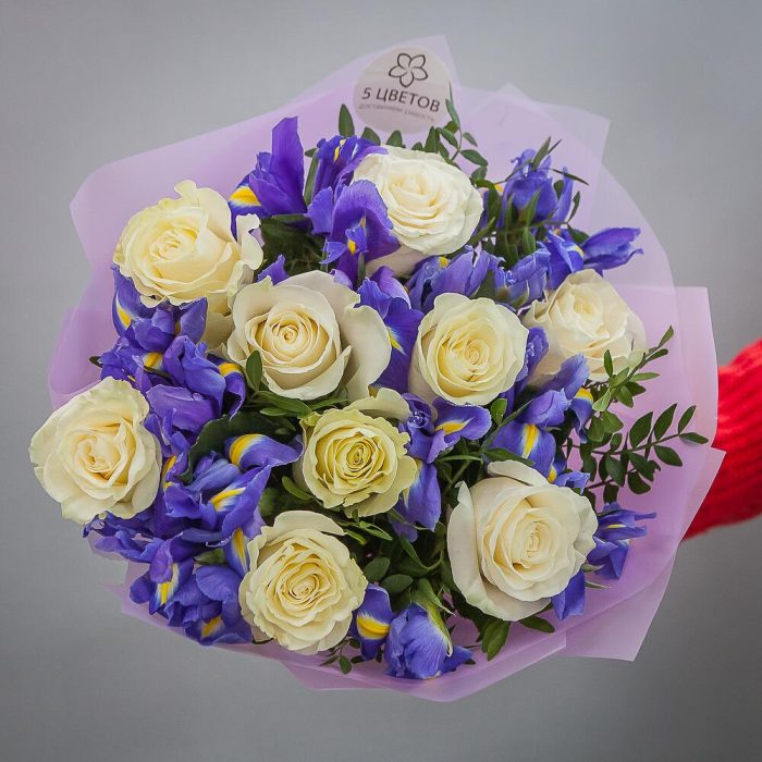 ирисы синие – 17 шт.розы белые – 9 шт.Упаковка матовая пленка – 1 шт.Атласная лента – 1 шт.