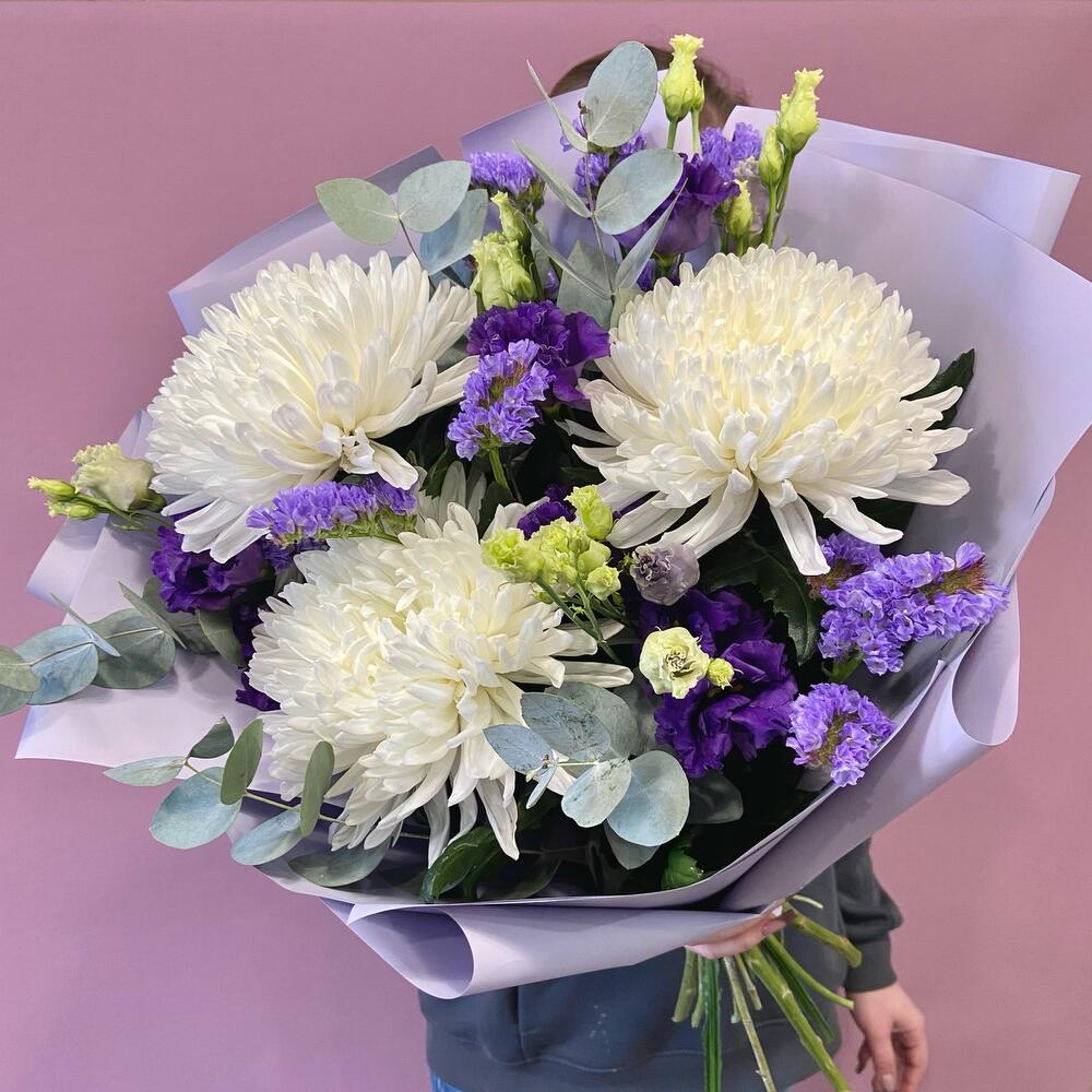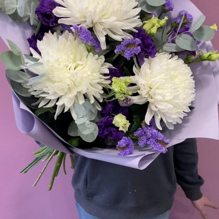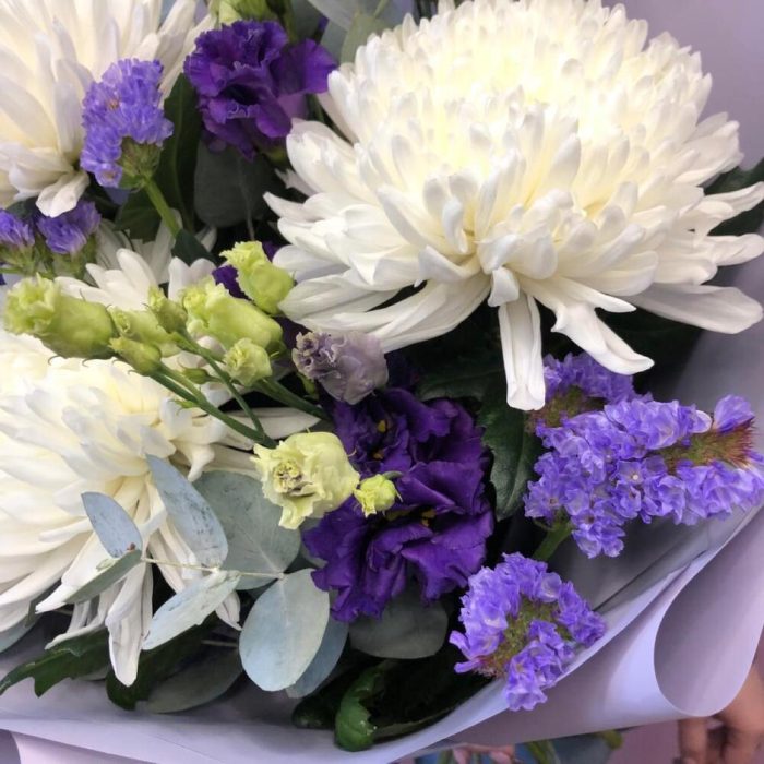 антонов – 3 шт.Статица – 1 шт.Эустома – 2 шт.Эвкалипт – 3 шт.Корейская упаковка – 1 шт.бант атласный – 1 шт.
