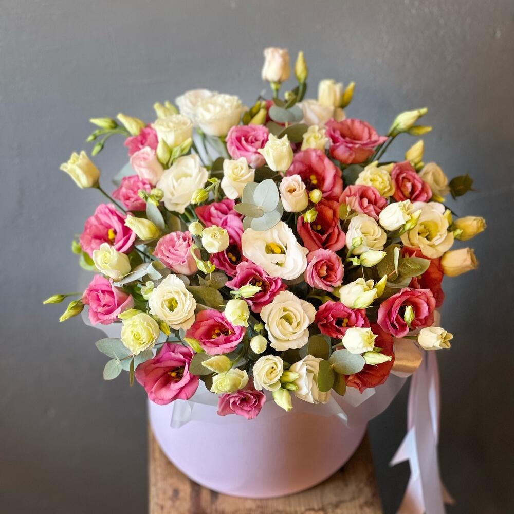 эустома микс – 11 шт.Коробка шляпная – 1 шт.Оазис флористический – 1 шт.Лента атласная – 2 шт.Эвкалипт – 11 шт.работа флориста – 1 шт.