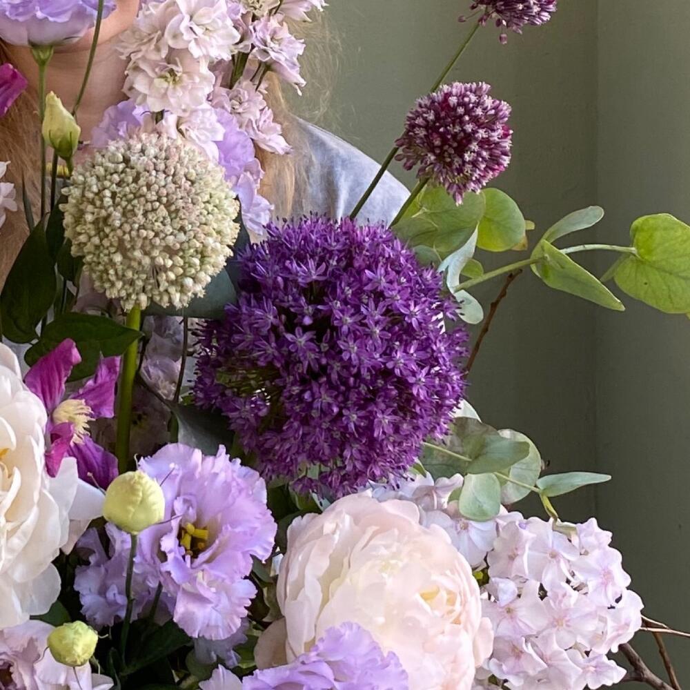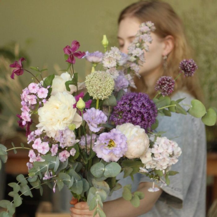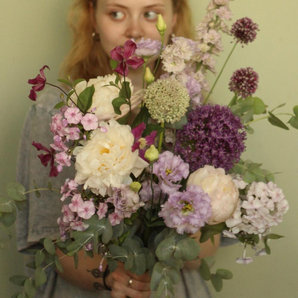 Эвкалипт – 7 шт.Пион – 3 шт.Лук – 4 шт.Флокс – 3 шт.Дельфиниум – 2 шт.Лизиантус – 2 шт.Клематис – 1 шт.Лента – 1 шт.