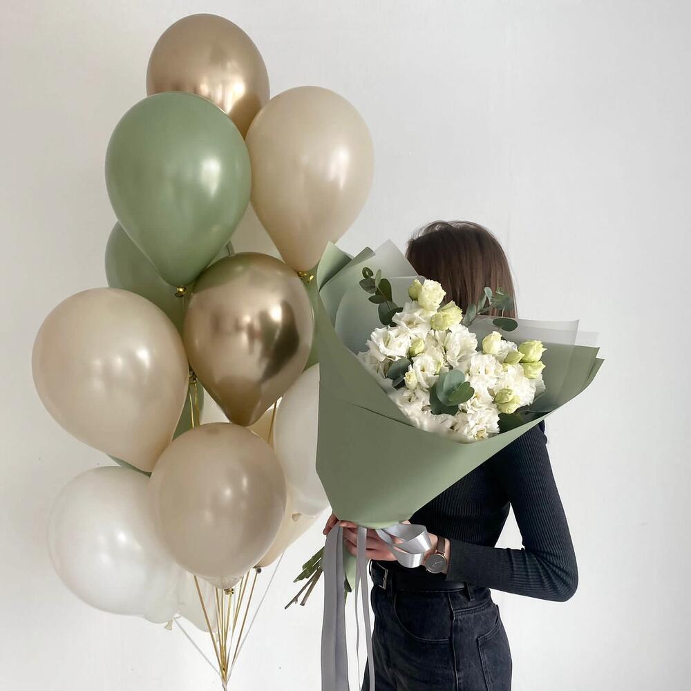 Латексные шары – 10 шт.эустома белая – 5 шт.хром золотой – 2 шт.
