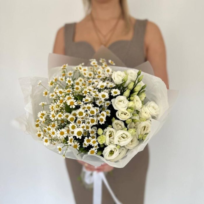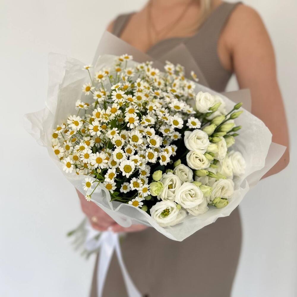 Ароматный букет из ромашек, сантини и стойкой эустомы