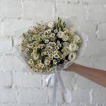 Матрикария – 3 шт.Сантини – 3 шт.Эустома – 3 шт.Дизайнерская упаковка – 3 шт.