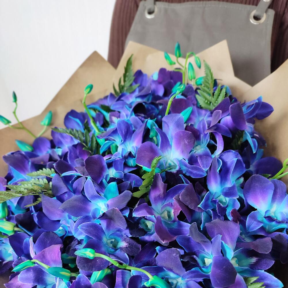 орхидея дендробиум синяя цветочки – 101 шт.папоротник ветка – 2 шт.Крафт упаковка – 5 шт.удлинитель для орхидеи – 51 шт.любовь флориста (бесплатно) – 1 шт.инструкция по уходу за цветами – 1 шт.подкормка для срезанных цветов – 1 шт.