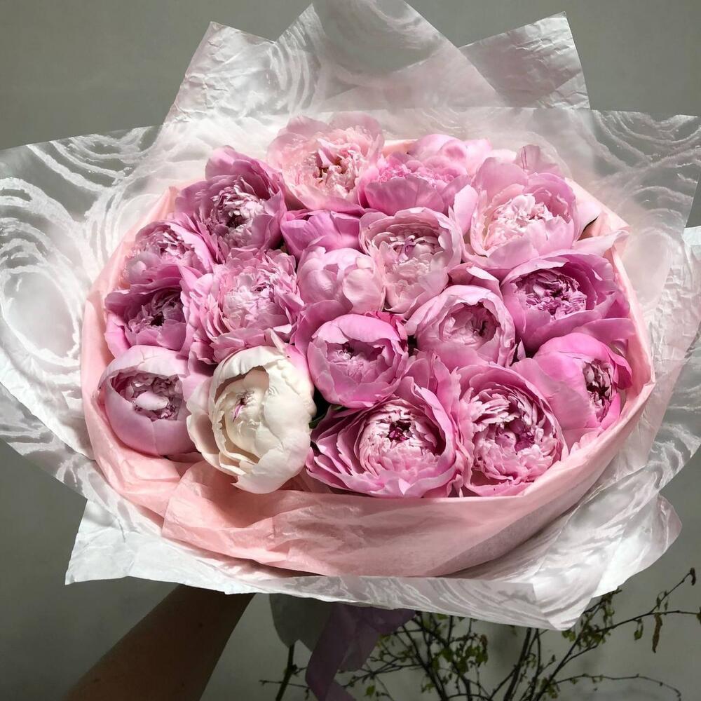 19 розовых пионов в упаковке