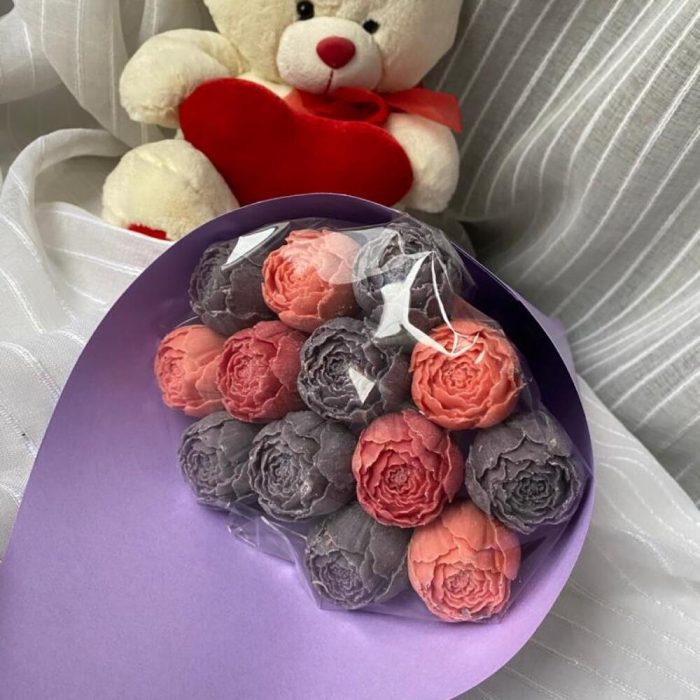 шоколадные пионы – 13 шт.деревянные шпажки – 13 шт.прозрачная защитная пленка – 1 шт.упаковочная бумага – 1 шт.
