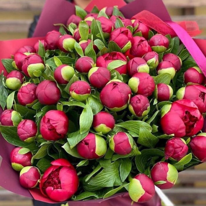 Пион бордовый – 51 шт.Упаковка дизайнерская – 2 шт.Лента атласная – 2 шт.Открыточка с вашими пожеланиями – 1 шт.хорошее настроение – 100 шт.инструкция по уходу за цветами – 1 шт.коробка переноска – 1 шт.Кризал – 1 шт.