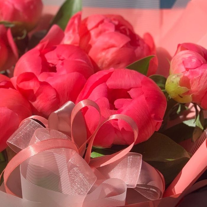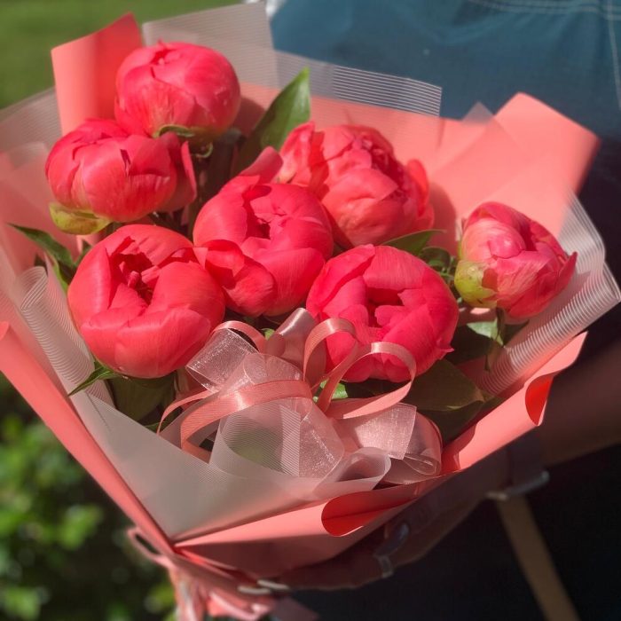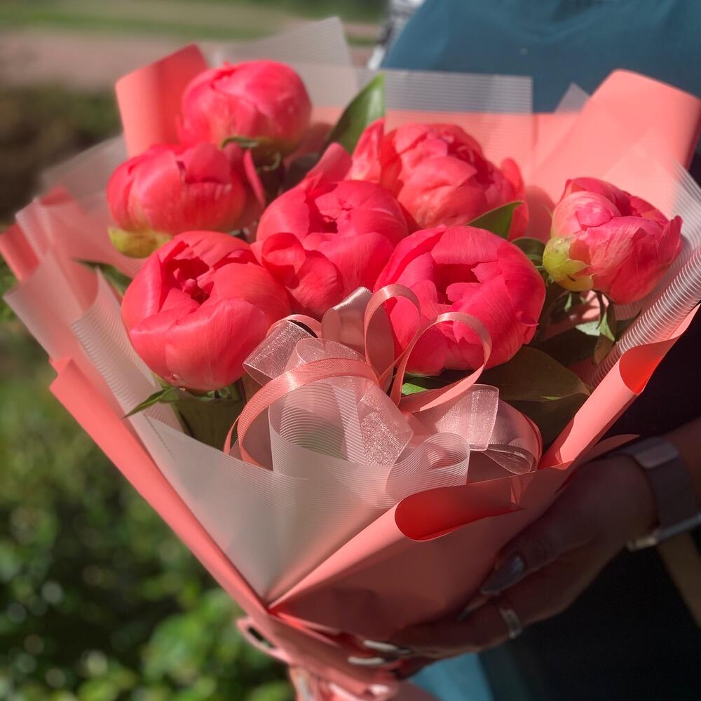 Лента атласная – 3 шт.Упаковка дизайнерская – 2 шт.зелень декоративная – 5 шт.подкормка для срезанных цветов – 1 шт.Коралл шарм пион – 7 шт.