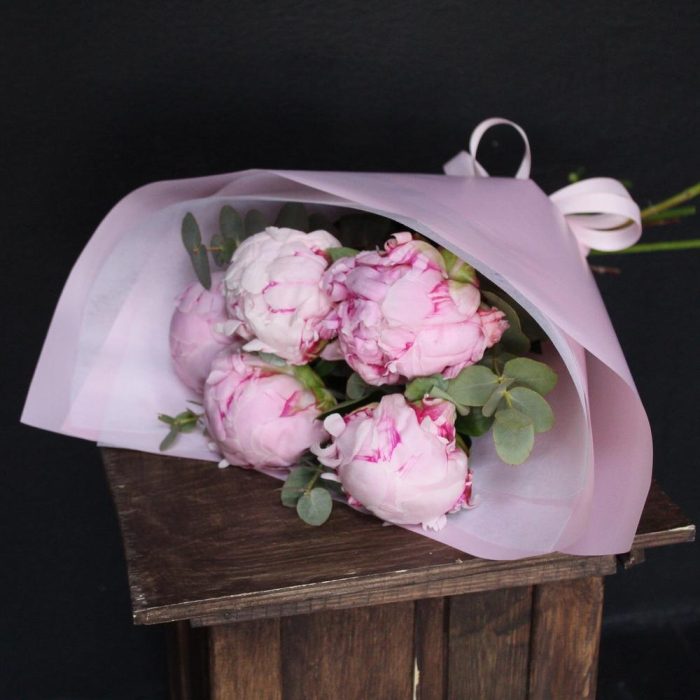 Пион Сара Бернар – 5 шт.Эвкалипт – 3 шт.Пленка дизайнерская – 1 шт.Фетр – 1 шт.