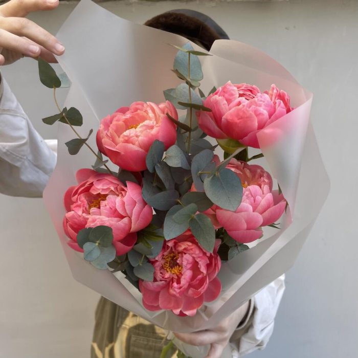 Пион – 5 шт.Эвкалипт – 2 шт.Упаковка дизайнерская – 1 шт.