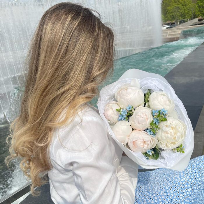 Пион белый – 7 шт.оксипеталум голубой – 3 шт.Упаковка дизайнерская – 2 шт.наклейка фирменная – 2 шт.Лента атласная – 1 шт.
