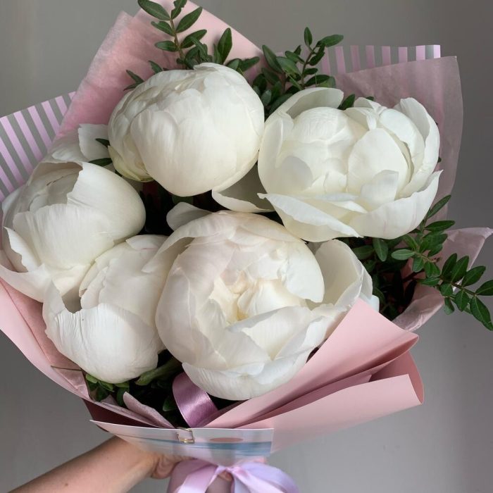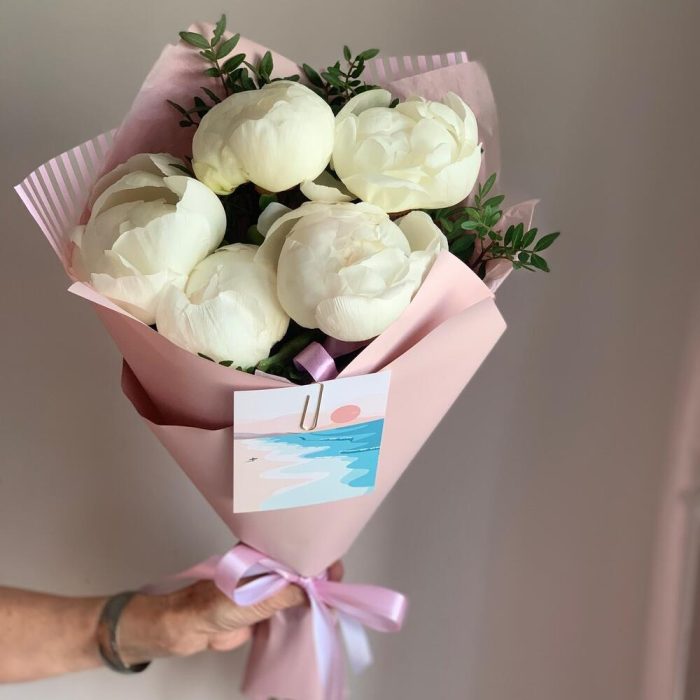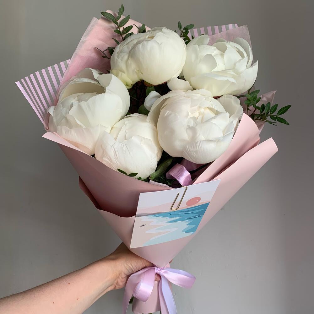 Пион – 5 шт.Зелень – 3 шт.Лента атласная – 2 шт.Упаковка дизайнерская – 3 шт.