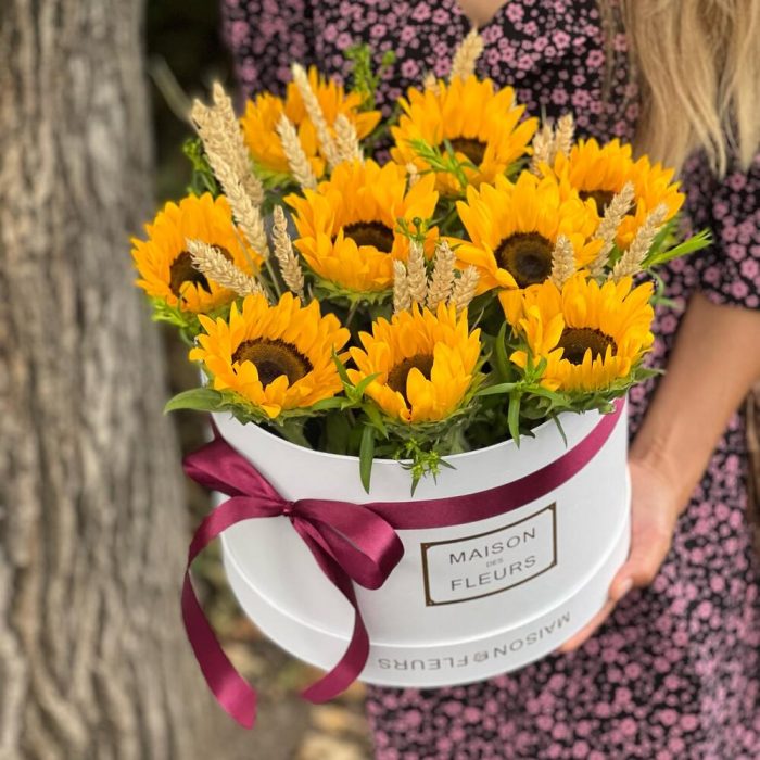 Чудесная композиция в коробке из подсолнухов и декоративными колосками