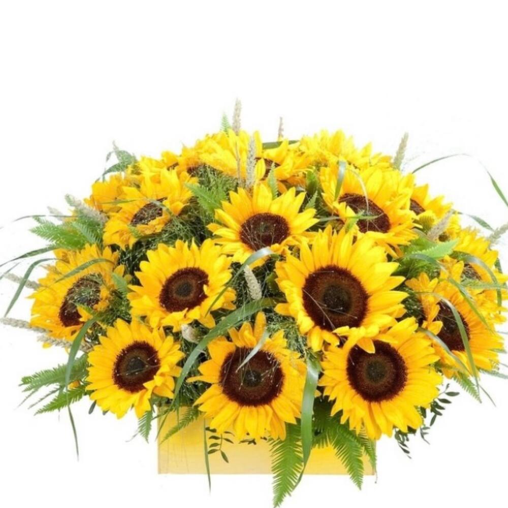 Зелень – 150 гр.Шляпная коробка – 1 шт.Подсолнух желтый – 19 шт.