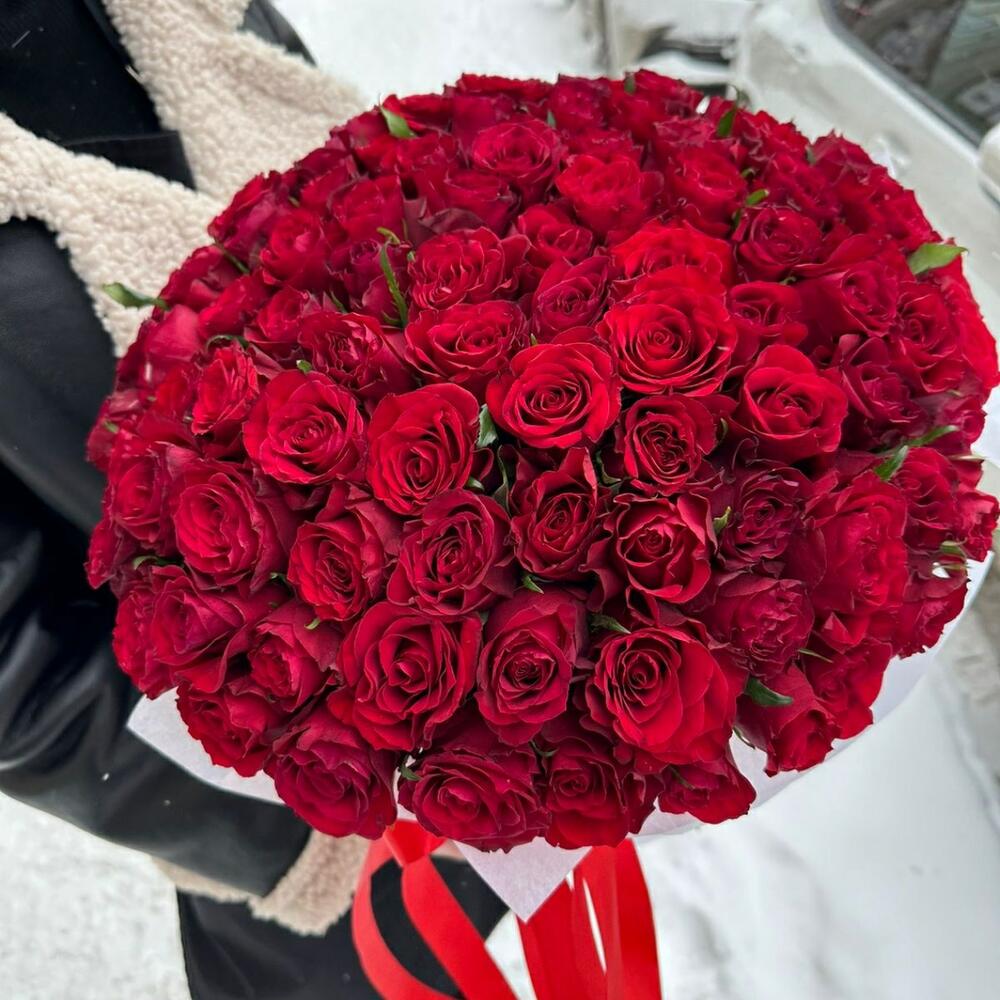 Роза красная – 101 шт.Коробка шляпная – 1 шт.аквабокс с водой – 1 шт.Лента атласная – 1 шт.